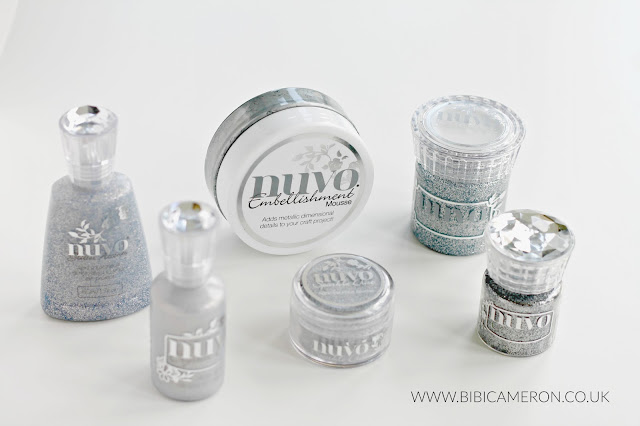 Last week Paula Pascal from Tonic Studios was kindly asking the team to make a couple of projects using Nuvo Glimmer Paste, Nuvo Embossing Powder, Sparkle Dust, Nuvo Crystal Drops, Nuvo Glitter Drops, Nuvo Mousses, and I promptly answer saying: I'm in!