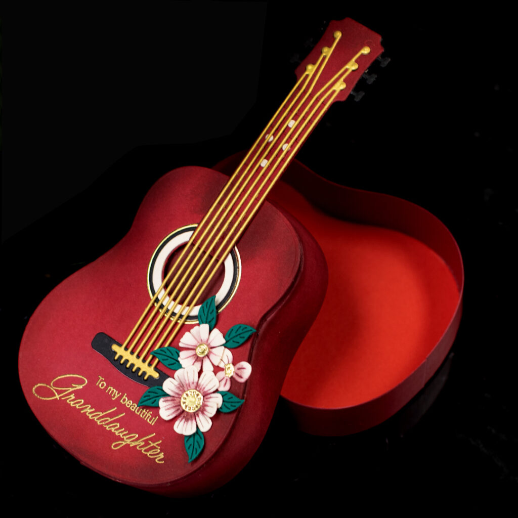 Gorgeous, isn’t? The tutorial for this guitar- shaped will be available in May 2026. It was made using the Spellbinders Majestic Guitar Box Creator Die Bundle and for the sentiment, I used the Spellbinders Family Musical Mix Greetings Clear Stamp Set.