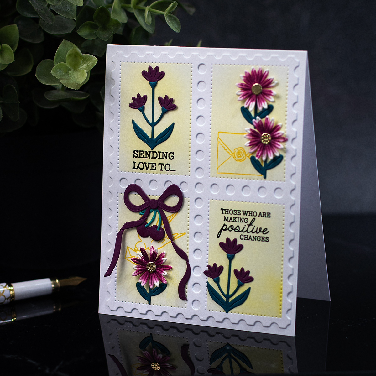 For this A2 top-fold card, I used the Postage Stamps cover die and stencil