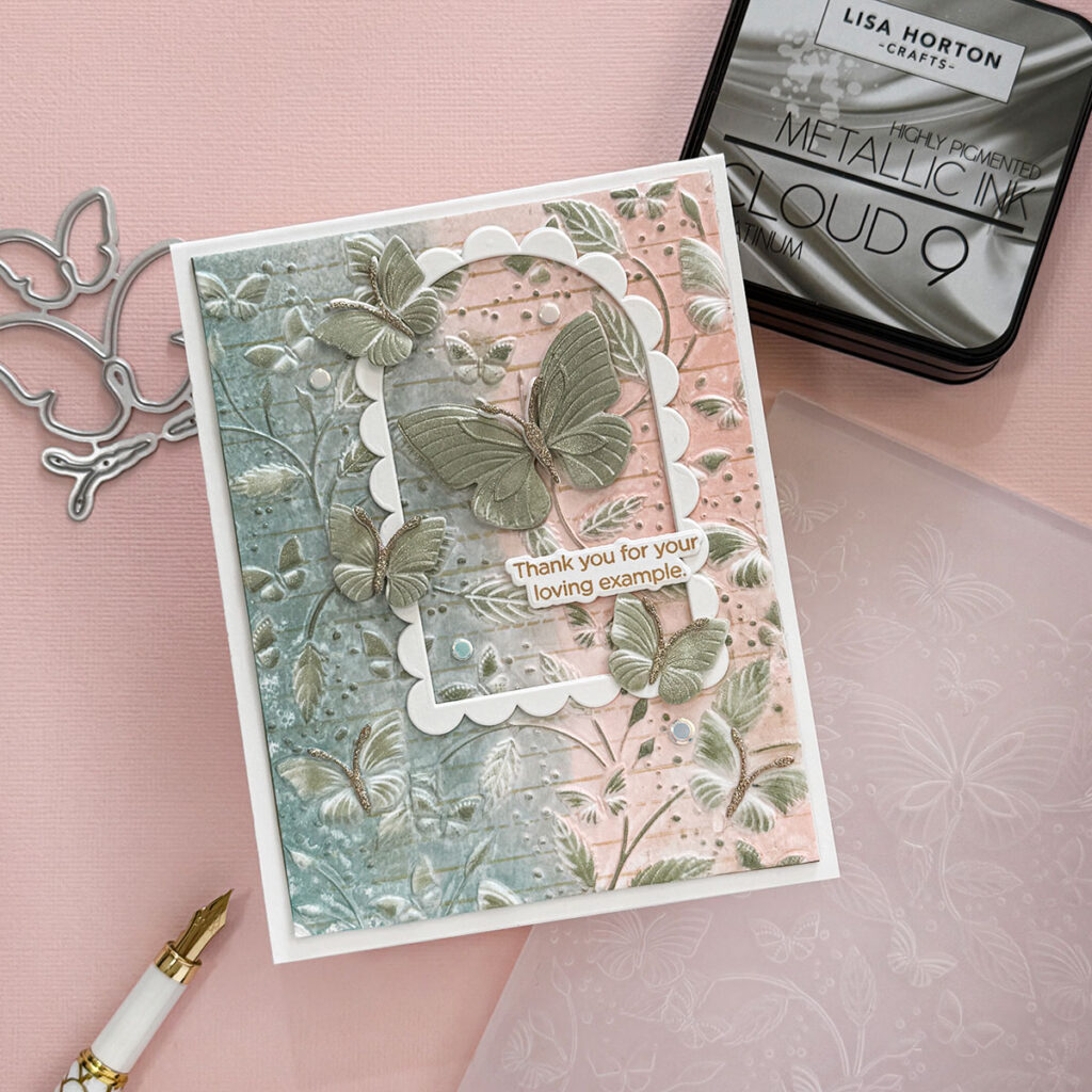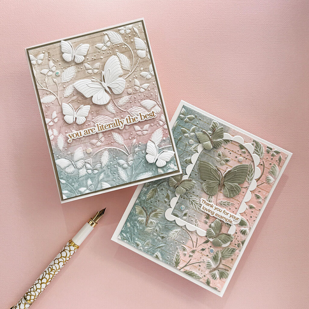 Hello Crafty friends! Today I’m sharing an embossing folder technique featuring the gorgeous Butterfly Escapade Embossing Folder and Cutting Dies by Simon Says Stamp and Lisa Horton Matte Inks.