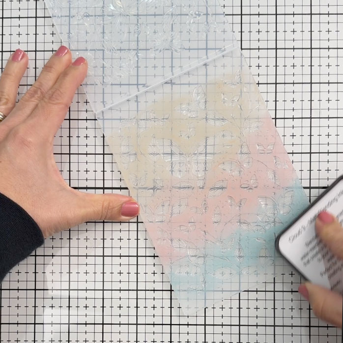 Option 1. Lightly mist the ink applied over the embossing folder with water, just enough to get it moving. Avoid over-spraying, as too much water can create puddles in the debossed areas of the embossing folder.