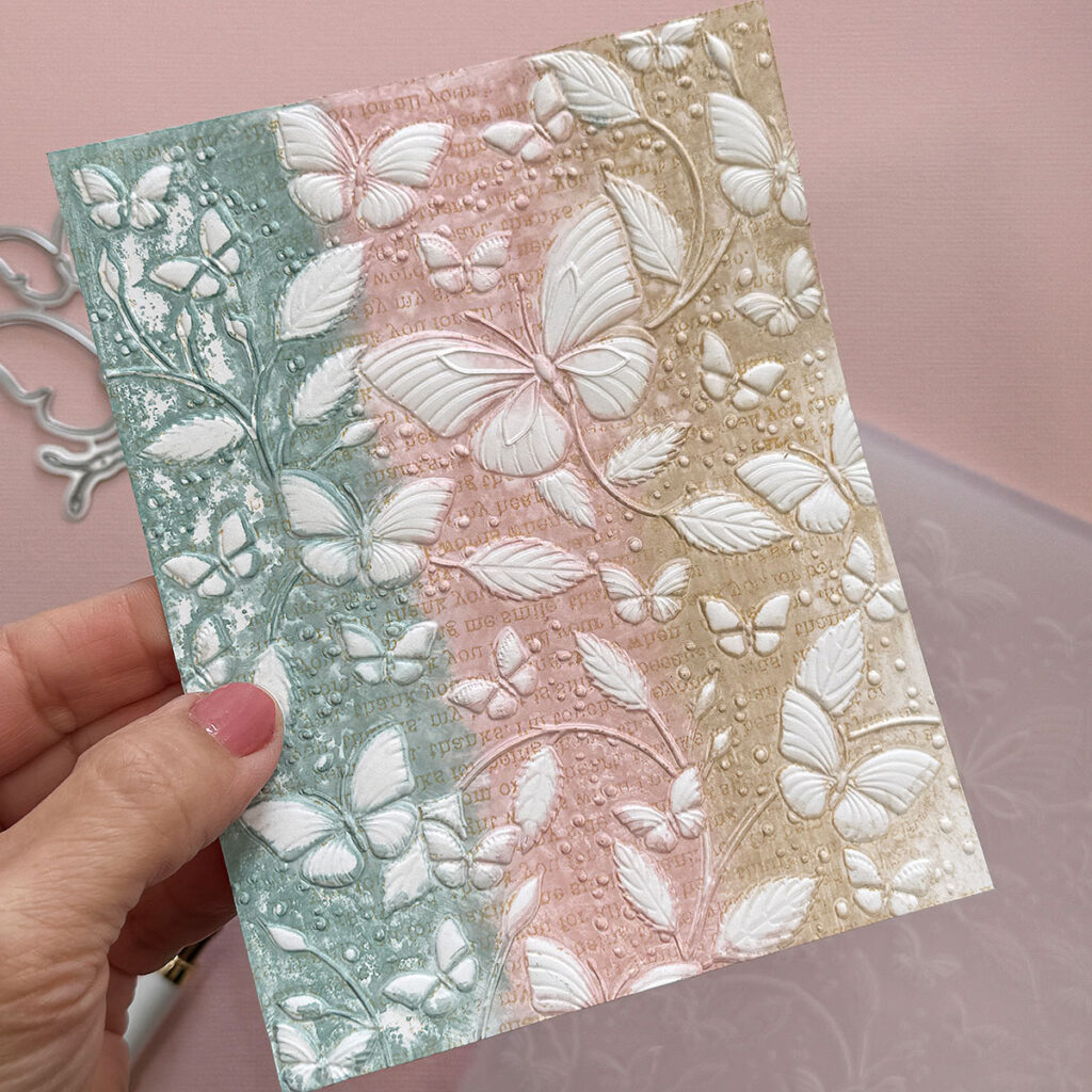 For this technique, I used Lisa Horton inks on Neenah 110 lb cardstock and the Butterfly Escapade Embossing Folder and Cutting Dies.